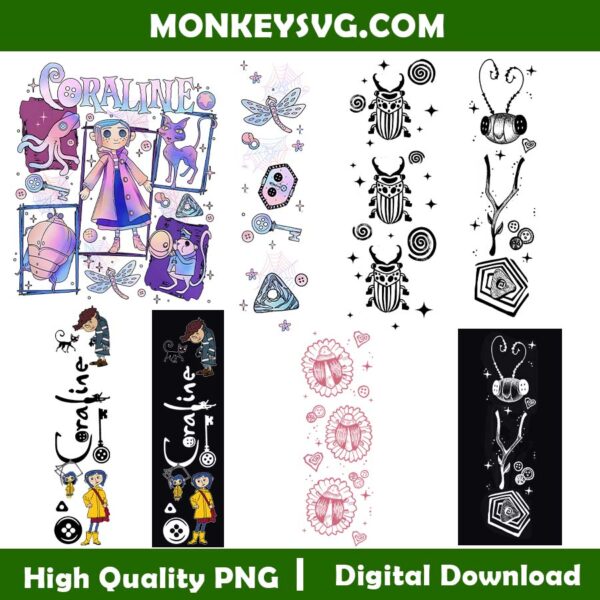 Coraline Doodle Black and White Bundle SVG PNG, Coraline Button Eyes Merchandise Png, Halloween Horror Shirt Png, File Digital Download, Transparent Background